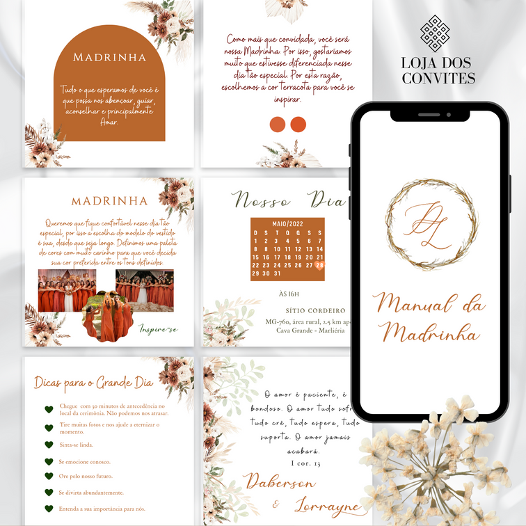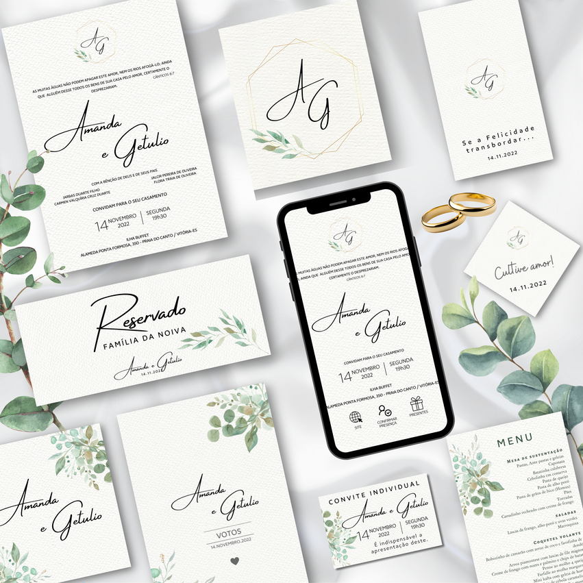A personalização do seu convite é feita com base na sua paleta de cores ou tema do seu evento, com características que te representem e elementos de qualidade e beleza.
