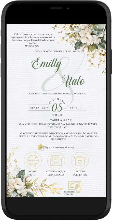 O Convite Digital, além de prático é também econômico, pois permite agilidade na entrega do convite aos seus convidados, seja por e-mail ou WhatsApp, e possui um valor muito mais acessível, uma vez que ao adquirir seu convite, ele pode ser enviado para quantas pessoas desejar!